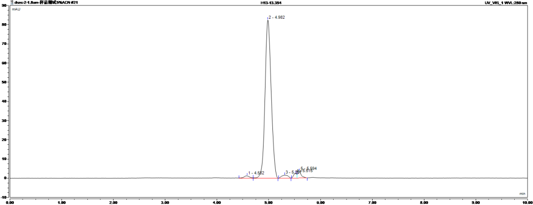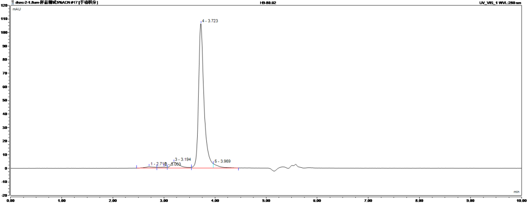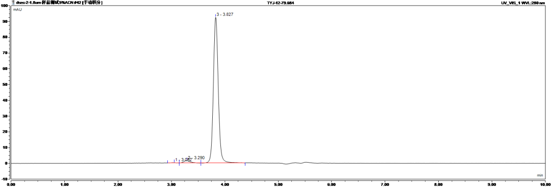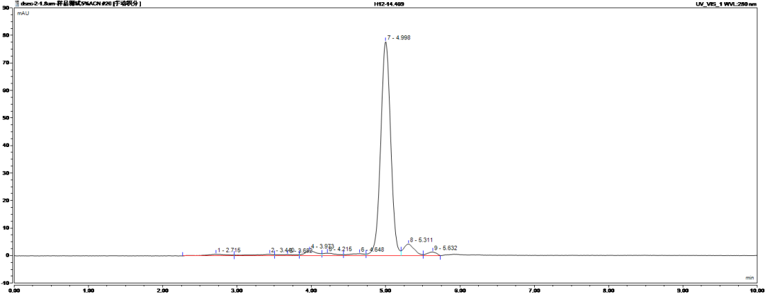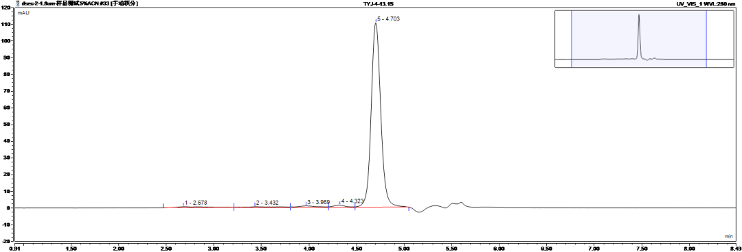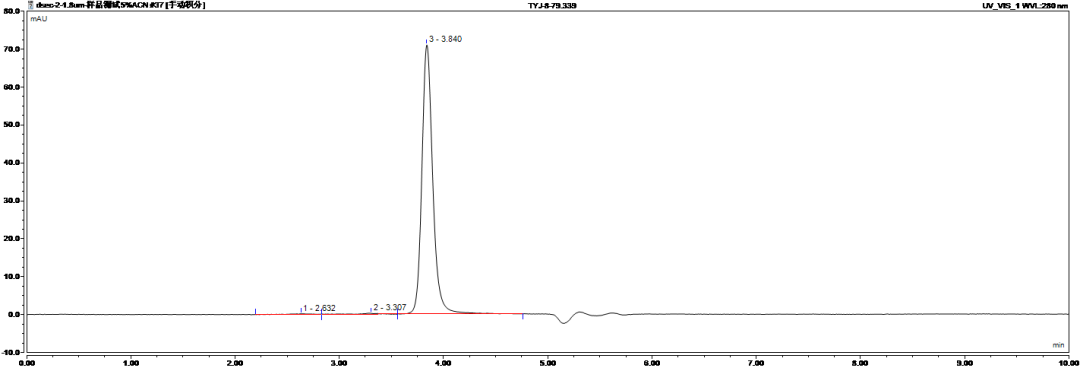 在8个纳米抗体样品的分析中(详见附图),所有样品均实现了有效分离,能有效区分纳米抗体及其可能存在的微量聚集体或降解产物。从峰形参数来看,多数样品的主峰峰形对称,不对称度接近1.0,符合高质量色谱分析的要求。同时,每一针的分析时间都能控制在八分钟以内,精准匹配高通量筛选的需求。这些结果表明,使用Biozen dSEC-2搭建的纳米抗体SEC平台方法不仅能精准定量目标纳米抗体,还能灵敏地检测出样品中的杂质,为纳米抗体的质量控制提供更加高效全面的支持。