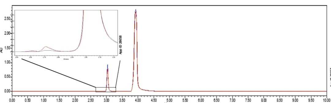新增聚集体 1(0.07%),聚集体总占比 1.0%,单体与邻近聚集体分辨率进一步提升至 3.36,且保留时间 RSD 仅 0.28%,数据重复性优异。