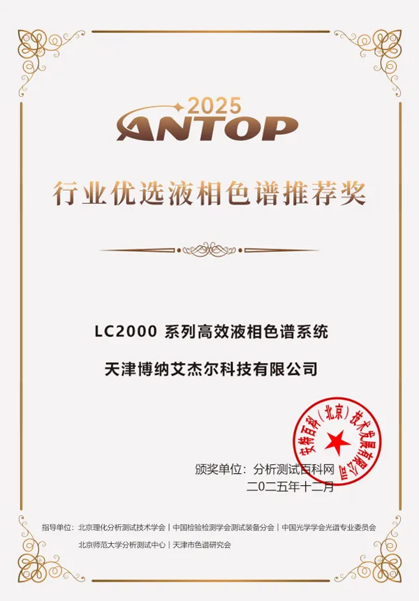 依托核心技术优势,天津博纳艾杰尔科技有限公司的LC2000系列高效液相色谱系统凭借优异性能,荣获 ANTOP “行业优选液相色谱推荐奖”,彰显其在液相色谱领域的市场认可度。