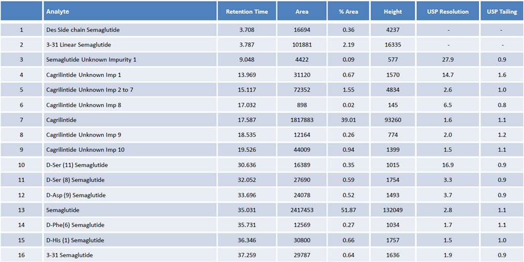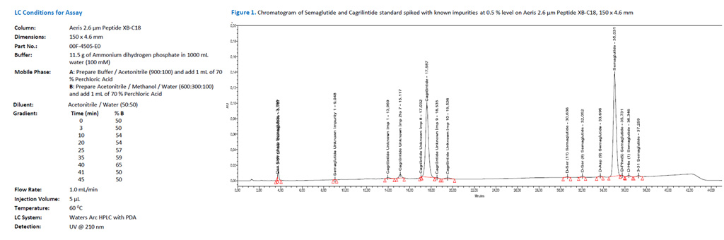 针对司美格鲁肽与卡格列肽复方制剂中复杂的肽类杂质谱,本研究展示了一套基于反相HPLC 的可执行分离策略。通过采用飞诺美(Phenomenex) Aeris Peptide XB-C18色谱柱并结合合理的梯度设计,该方案在分离度、重现性与定量适用性方面表现稳定,可作为复杂肽类复方制剂分析中的参考路径。